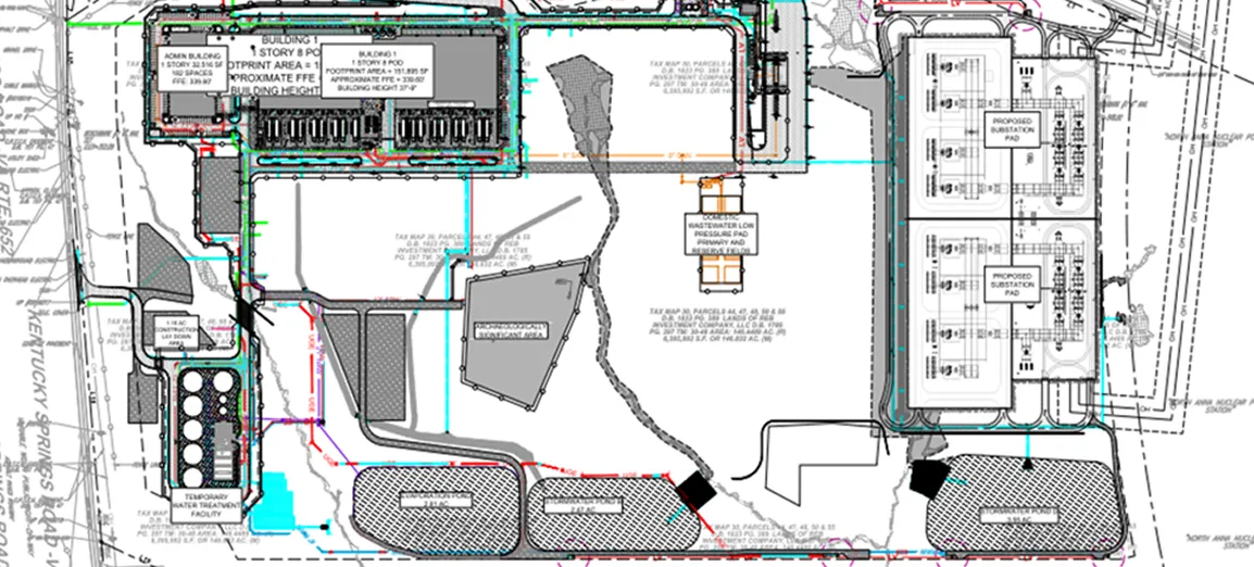 The proposed development on a 150-acre site in Virginia, involves the construction of a data center campus spanning 150 acres, featuring eight data hall facilities exceeding 1.6 million square feet and 390 megawatts, alongside a central administration building, two onsite power distribution substations, and a water treatment facility, necessitating massive site work exercise including tree clearing, paving, utilities, stormwater management infrastructure, and landscaping.