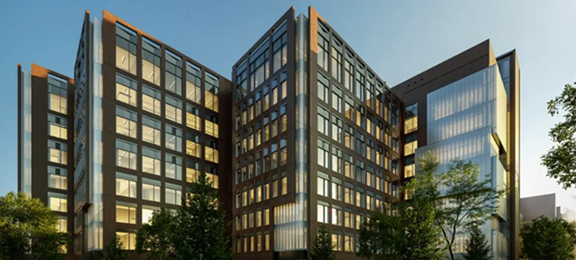The new 630,000 sq ft hospital building encompasses surgical suites, patient rooms, research labs, offices, conference areas, and collaborative workspaces, along with an 82,000 sq ft renovation of the main hospital’s clinical research wing and a new 780-vehicle parking garage featuring a utility vault for essential electrical infrastructure; placing a strong emphasis on innovation and sustainability, the design incorporates abundant natural light and highly efficient mechanical systems, positioning it to achieve LEED v4 Gold certification, while glowing glass cubes on its corners offer a glimpse into the groundbreaking research and treatment within.